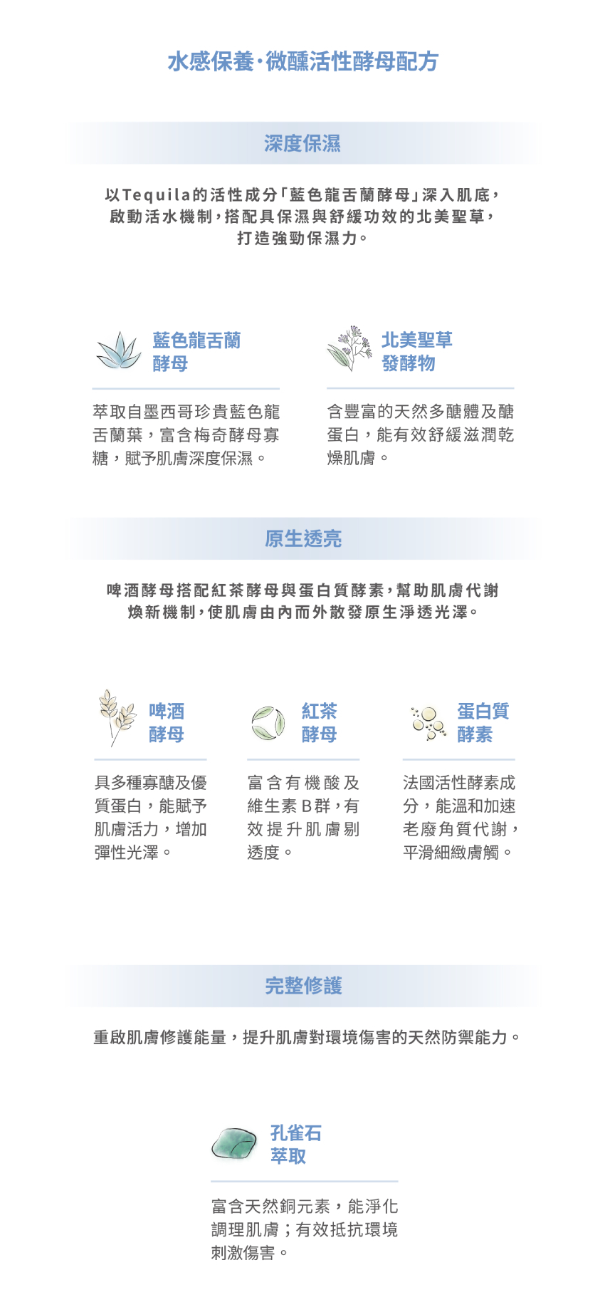 獨創無酒精「微醺活性酵母」配方,運用活性成分藍色龍舌蘭酵母及啤酒酵母— 為肌膚注入豐沛保濕能量,並加速代謝煥新機制,細緻光滑肌膚。特別添加專利草本舒敏因子,從根本舒緩躁動肌膚,並補足肌膚修護力,有效加強後續保養吸收度,喚醒肌膚新生模式!